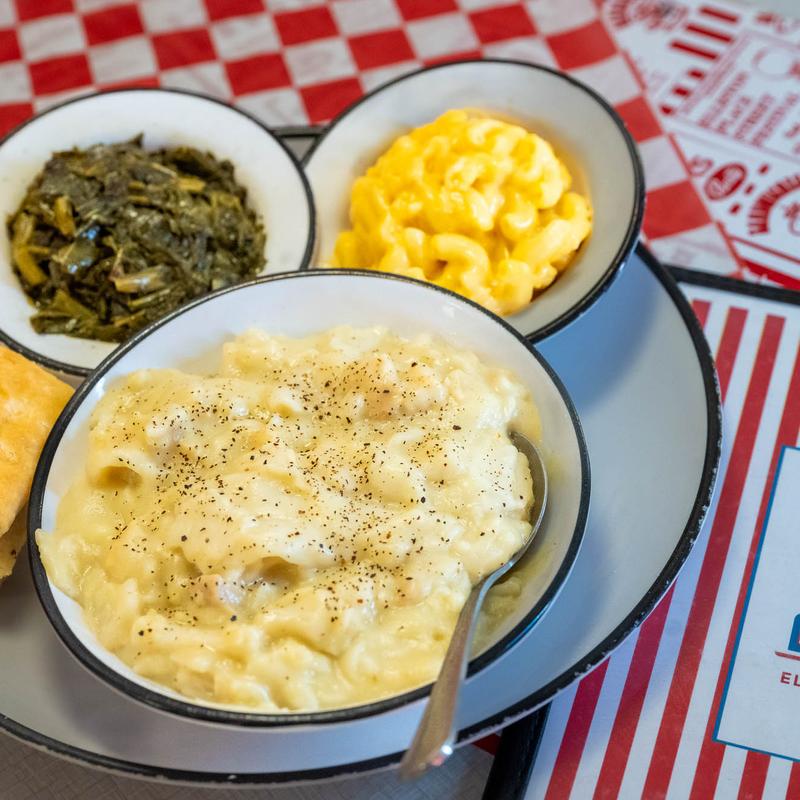 Mashed Potatoes (GF) | French Fries | Tater Tots | Onion Rings | Creamed Corn (GF) | Turnip Greens (GF) | Green Beans (GF) | Mashed Sweet Potatoes (GF) | Mac & Cheese | Cole Slaw (GF) | Fried Okra | Cucumber & Onion (GF)